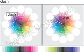 Adalah 2 warna yang berlawanan (komplementer), tapi menyimpang / bergeser 1 hue. Sesuai namanya ‘clash’ adalah warna yang tidak harmonis / betentangan / tabrakan seingga kombinasi warna tersebut tidak enak di pandang. Tapi dengan tehnik tertentu, akan didapat paduan warnayang inovatif dan khas.